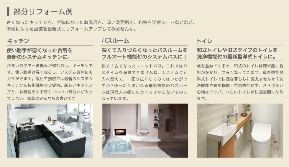 増築・改築はもとより、耐震リフォーム、エコ住宅への変身など、リフォームのきっかけは様々です。飯村工務店は工事に着手するにあたって、一部だけの改修でも家全体を「検診」します。見た目をきれいに仕上げただけの表面上のリフォームの失敗例がいかに多いかを知っているから、 建物の構造を知り尽くしているからこそ、適切な対応が可能になる訳です。飯村工務店のリフォームは、安心と安全性を同時に実現する快適リフォームです。